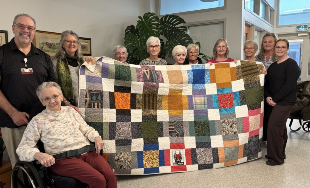 Left to right: resident of Villa Pascal, Allan (Villa), Loraine (Rayne) Johnson (Mae’s daughter) Quilters: Ann Plouff, Darlen Humenny, Pat Mack, Mavis Humenny, (Elaine Elder – not present) Lynn Cole and Joanne Zepp (Mae’s daughters), Heather (Villa), Raeanne (Villa)